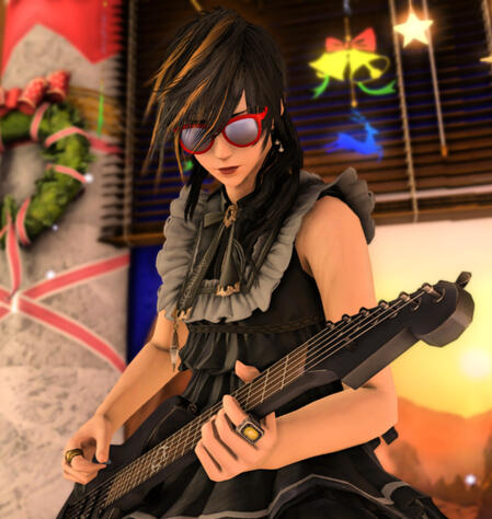 Hudson Phoenix, was brought on by Luv. Found abandon on the streets of Limsa. Hudson doesn't talk much and mostly keeps to her own. The story is, Hudson was very famous in another band, got mixed up in a scandal and lost everything. The band hopes one day she sheds the burdens and learns to live a full life again. Luv is currently working with Hudson to learn guitar. She aspires to be an asset to the band. Drawing inspiration from bands like Linkin Park, Huddy loves to dabble in using a sawtooth to add synth to MSV. Hudson is often found hovering over a lap top or in a recording studio testing new sounds and techniques. Audrey often jokingly saying " Talk nerdy to me Huddy. " Mai attributes MSV's current sound to the addition of Hudson, stating " We feel complete and full with Hudson's creativity. " In game Hudson is represented by Viola for synth, Piano and various Guitar Modes for fills. On stage Hudson wear modest but cute dress with high boots. Off stage Hudson wears leggings and cute tees.Dating Status: Single